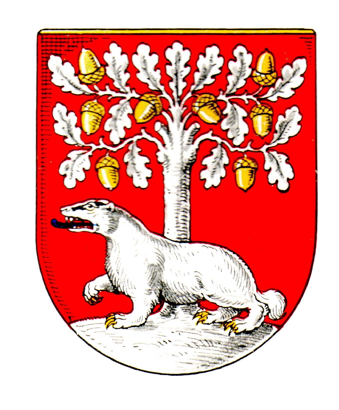In Rot auf silbernen Boden ein bis zum Ansatz der Zweige sichtbarer silberner Eichbaum mit silbernen Blättern und goldenen Früchten, davor ein silberner Dachs mit goldenen Krallen und herausgesteckter blauer Zunge.